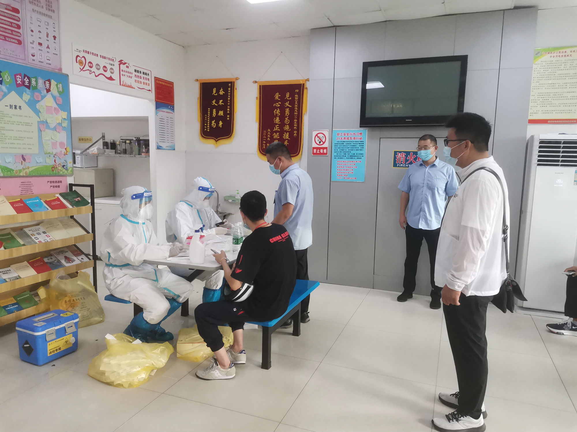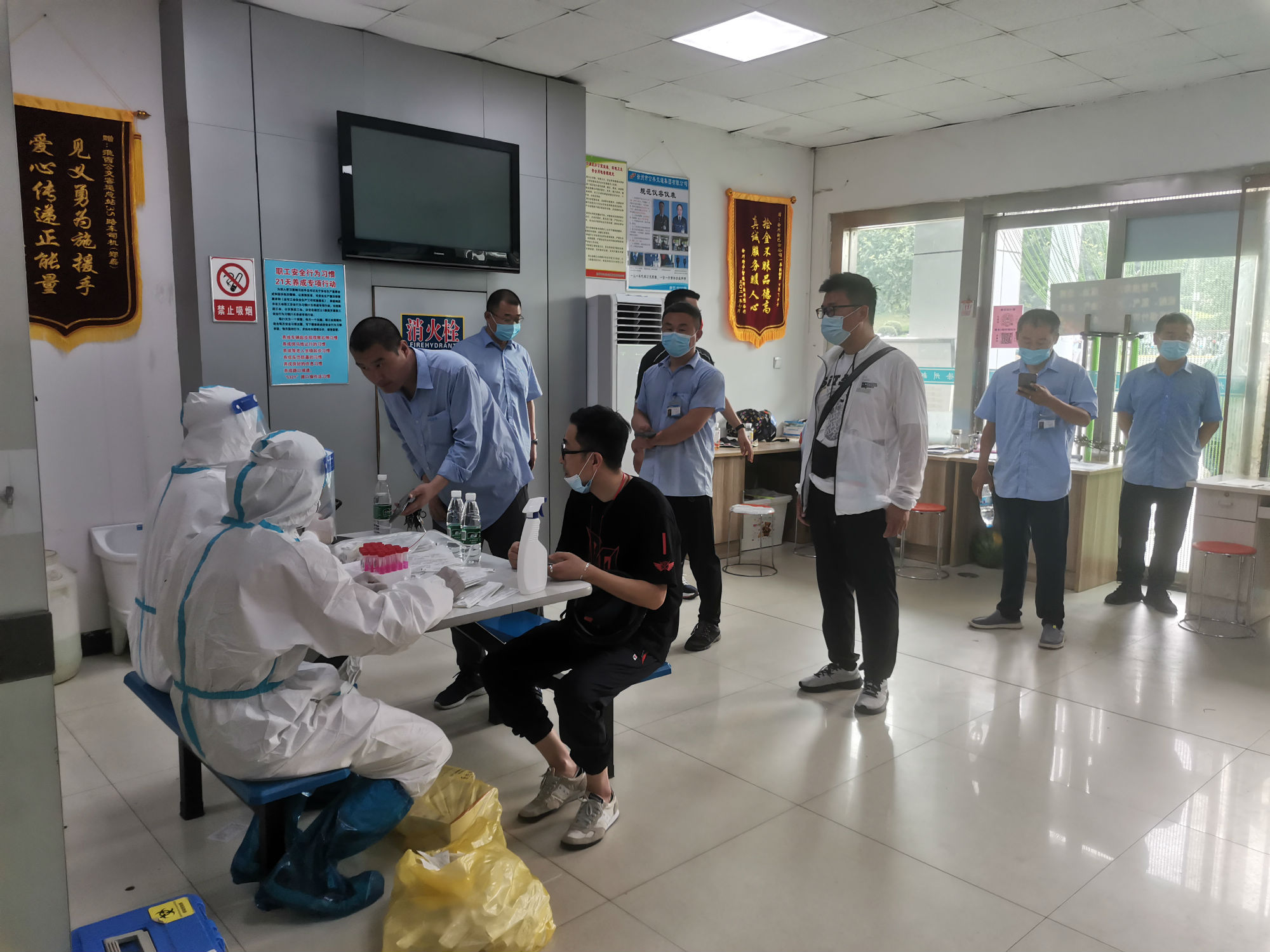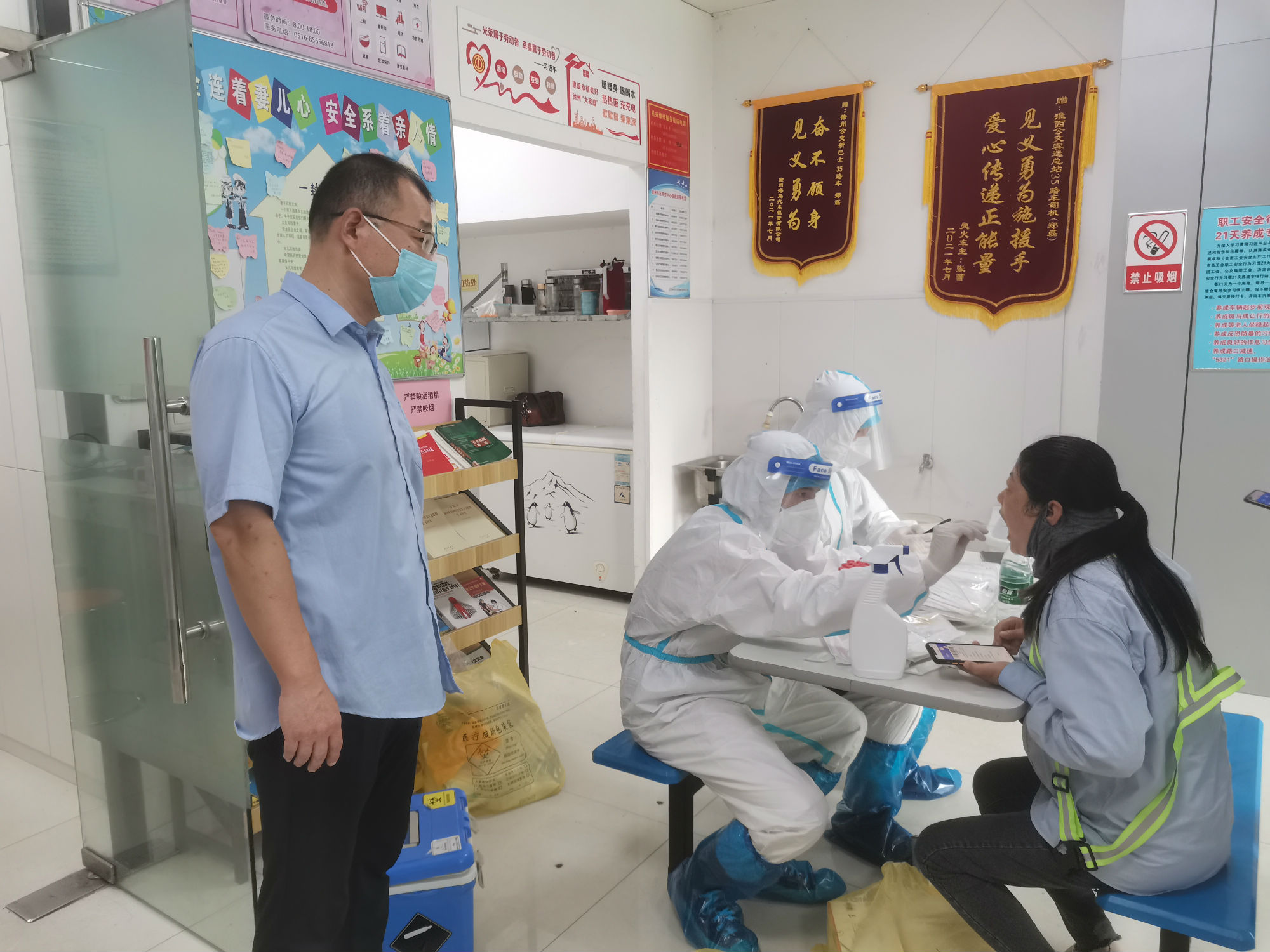 核酸檢測期間,新巴士公司各級管理人員做好后勤保障工作,經(jīng)過亮碼認證、衛(wèi)生消毒、信息核對等程序后,職工才被獲準進入核酸采集室。同時,公司將空間較大的淮西客運站調度室作為采集點,并安排專職人員維持現(xiàn)場秩序。