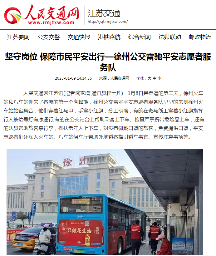 1月9日,人民交通網刊發(fā)文章《堅守崗位 保障市民平安出行—徐州公交雷馳平安志愿者服務隊》