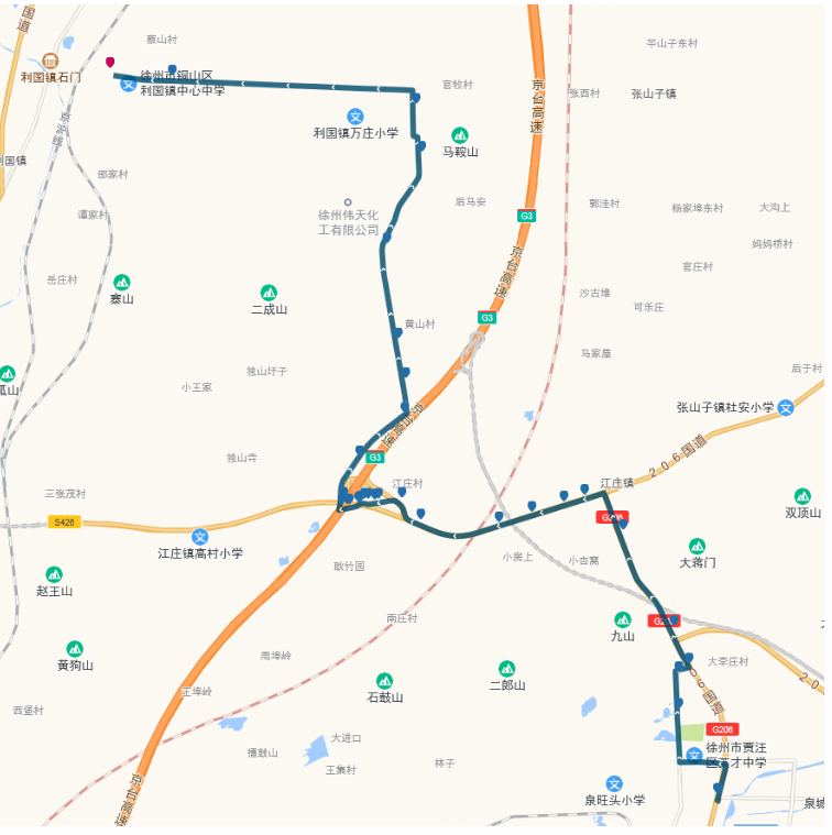 停靠站點(diǎn):賈汪客運(yùn)站,宏安路口,賈汪老站,大李莊,江莊南,江莊北,鐃鈸,龍山水泥廠,萬(wàn)莊,馬元,郝家,蔡山,利國(guó)。