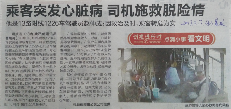 當(dāng)天中午,13路附線1226車(chē)駕駛員趙仲成像往常一樣在熟悉的線路上駕駛車(chē)輛。12點(diǎn)54分,當(dāng)車(chē)輛行駛至西三環(huán)銅山貨場(chǎng)站時(shí),專心駕駛車(chē)輛的趙師傅忽然聽(tīng)到后面乘客大喊:“有人暈倒啦”,趙師傅立即停好車(chē)輛、快步走向后排車(chē)廂查看發(fā)病乘客情況,暈倒的是一名中年婦女,呼吸微弱、輕聲地說(shuō)自己心里難受。由于趙師傅出生在中醫(yī)世家,對(duì)疾病及急救措施有一定的了解,根據(jù)經(jīng)驗(yàn),趙師傅判斷該名乘客是忽發(fā)心臟病,于是,趙師傅在車(chē)上乘客的幫助下將患者轉(zhuǎn)移到車(chē)廂中部寬敞通風(fēng)的地方平躺,迅速拿出車(chē)廂內(nèi)備用的“速效救心丸”給她服下,同時(shí),撥打120急救電話。在等待救援的過(guò)程中,趙師傅熟練地為患者做人工呼吸、心肺復(fù)蘇等急救措施。在爭(zhēng)取車(chē)廂內(nèi)其他乘客的同意下,趙師傅安排車(chē)內(nèi)乘客乘坐下一班車(chē),自己等待120急救車(chē)的到來(lái)。10分鐘后,120急救人員趕來(lái),趙師傅跟隨醫(yī)護(hù)人員前往醫(yī)院,一直等到患者家屬趕來(lái),趙師傅才放心的離開(kāi)。