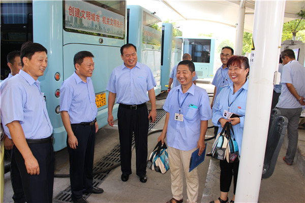 炎炎烈日下,空調(diào)公交車成為市民出行首選。為給市民營(yíng)造舒適、涼爽的乘車環(huán)境,各運(yùn)營(yíng)公司應(yīng)用公交GPS智能調(diào)度系統(tǒng),科學(xué)調(diào)度、靈活排班、保證運(yùn)力充足。同時(shí),結(jié)合創(chuàng)建工作,提高服務(wù)質(zhì)量,全市2100多輛空調(diào)車全部開足冷氣;駕乘人員揮汗如雨堅(jiān)持“一趟一清掃”,認(rèn)真做好車輛清潔工作;督導(dǎo)隊(duì)員冒著高溫在各大站臺(tái)維持秩序、扶老攜幼、做好導(dǎo)乘服務(wù)、嚴(yán)查易燃易爆及危險(xiǎn)品。由于各項(xiàng)舉措落實(shí)到位,確保了高溫期間全市161條公交線路運(yùn)營(yíng)順暢,乘客走好走了。(圖為董事長(zhǎng)、總經(jīng)理杜紅軍,總經(jīng)理助理李修超一行在食品城充電站慰問堅(jiān)守崗位的充電員工。)