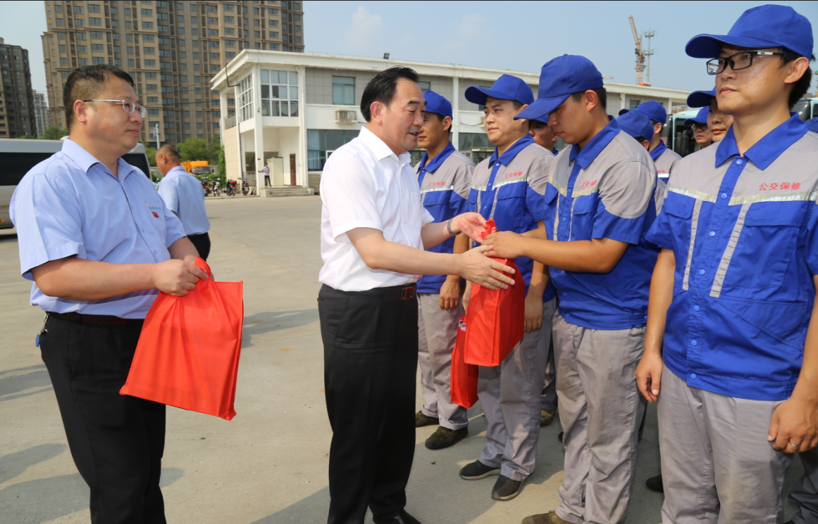 在烈日下的公交郭莊停車場(chǎng),周鐵根書(shū)記看到堅(jiān)守崗位的公交員工們汗流浹背,親切地上前與公交駕駛員、修理人員等一線員工一一握手?!按蠹倚量嗔?!感謝你們!”他對(duì)廣大公交員工為保障全市人民高溫天氣正常出行所付出的辛勤勞動(dòng)表示充分肯定,又將洗發(fā)水、毛巾、肥皂等降暑物品,以及《安全生產(chǎn)知識(shí)職工普及讀本》等書(shū)一一送到公交員工手中,叮囑有關(guān)負(fù)責(zé)人,要多愛(ài)護(hù)、關(guān)心一線職工,切實(shí)做好防暑降溫措施,為公交員工創(chuàng)造好的工作條件,切實(shí)維護(hù)廣大職工的安康權(quán)益,確保高溫天里職工的身體健康和安全生產(chǎn),讓職工安全度夏、清涼度夏,真正感受到黨和政府的關(guān)懷、工會(huì)組織的關(guān)心和社會(huì)各界的關(guān)愛(ài)。他還關(guān)心地叮囑公交員工們要?jiǎng)谝萁Y(jié)合,做好高溫防護(hù),保重身體,杜絕疲勞駕駛,確保安全行車,并希望大家更好地堅(jiān)守崗位、服務(wù)群眾,為保障市民安全有序的出行環(huán)境,打造我市優(yōu)化營(yíng)商環(huán)境、營(yíng)造文明城市良好氛圍做出更大的貢獻(xiàn)。