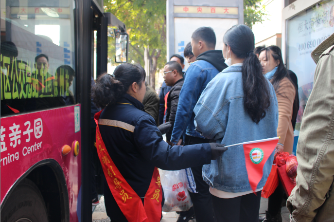 與此同時(shí),公交組織人員在全市10個(gè)公交大站點(diǎn)同步開展了排隊(duì)日主題活動(dòng)。40多名公交督導(dǎo)隊(duì)員和各營運(yùn)公司管理人員身著行業(yè)服,身披綬帶,在引導(dǎo)市民文明乘車?!坝行蚺抨?duì),傳遞文明。大家自覺排隊(duì)乘車啊……”藍(lán)天公交站臺(tái)前,督導(dǎo)員林燕偉胸前“我排隊(duì)我文明我快樂”的綠色徽章分外醒目,她一手舉著宣傳旗,一手指揮著站臺(tái)的乘客依次排好隊(duì)伍,有序乘車。